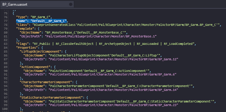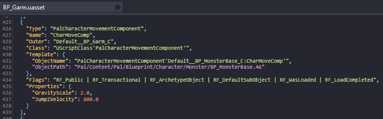 Let's look at Pal/Content/Pal/Blueprint/Character/Monster/PalActorBP/Garm/BP_Garm.uasset in FModel. Open the asset, hit Ctrl+F and look for PalCharacterMovementComponent.